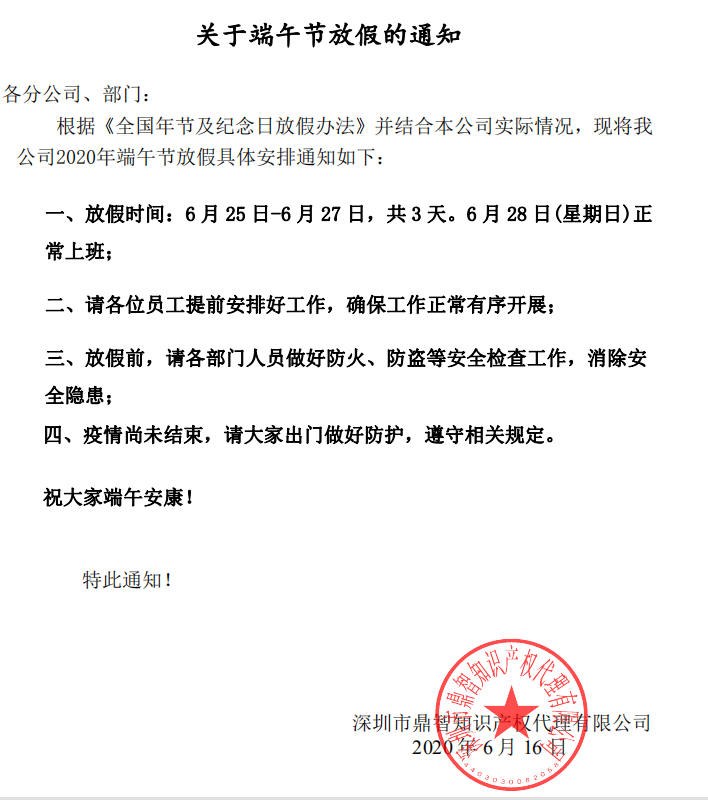 根据《全国年节及纪念日放假办法》并结合本公司实际情况,现将我公司2020年端午节放假具体安排通知如下: